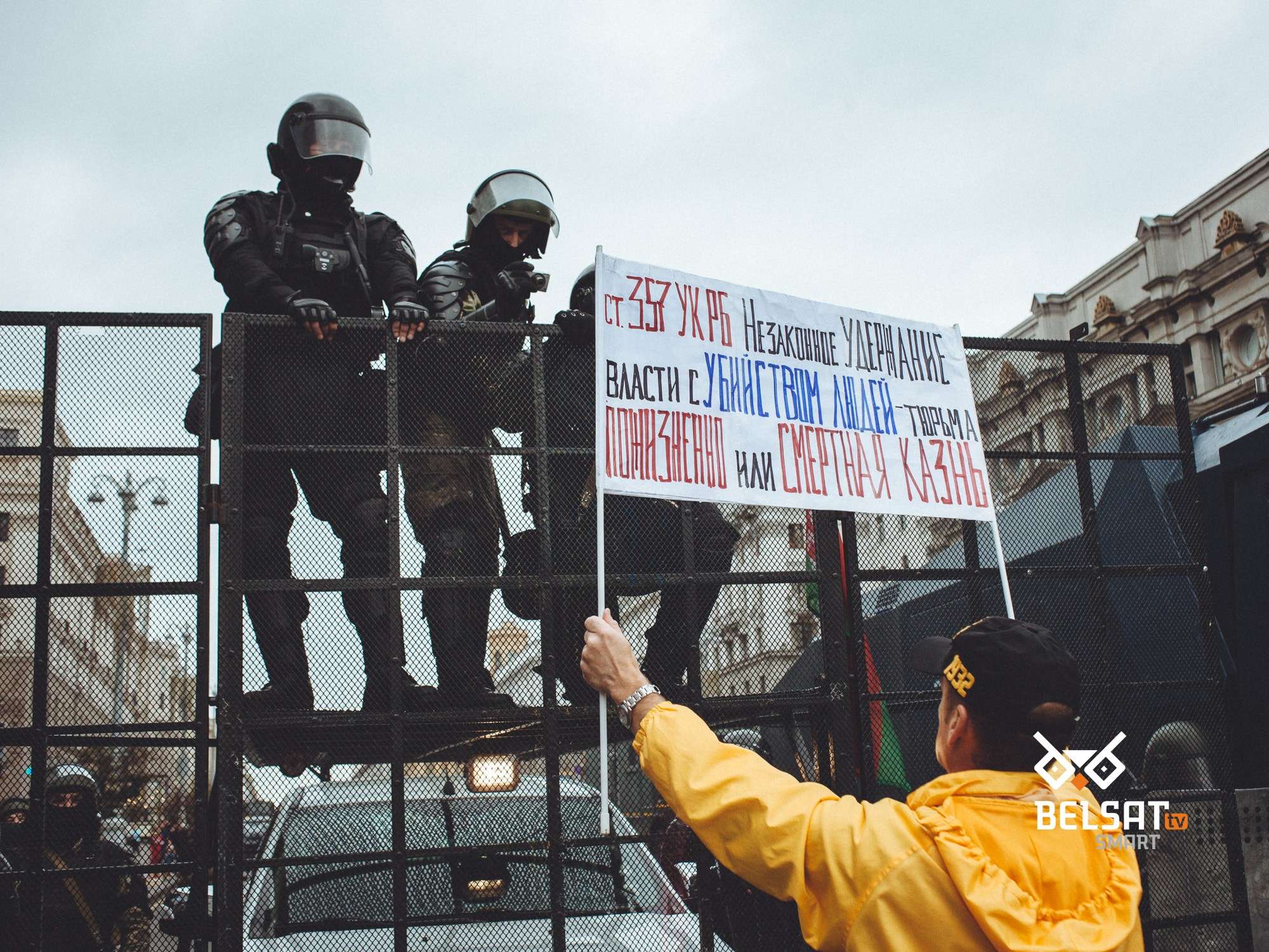 — Так ты палач? А где ты был с 9 по 12 августа? А тебе дали пострелять резиновыми пулями? А сколько тебе платят за стрельбу по живым мишеням?