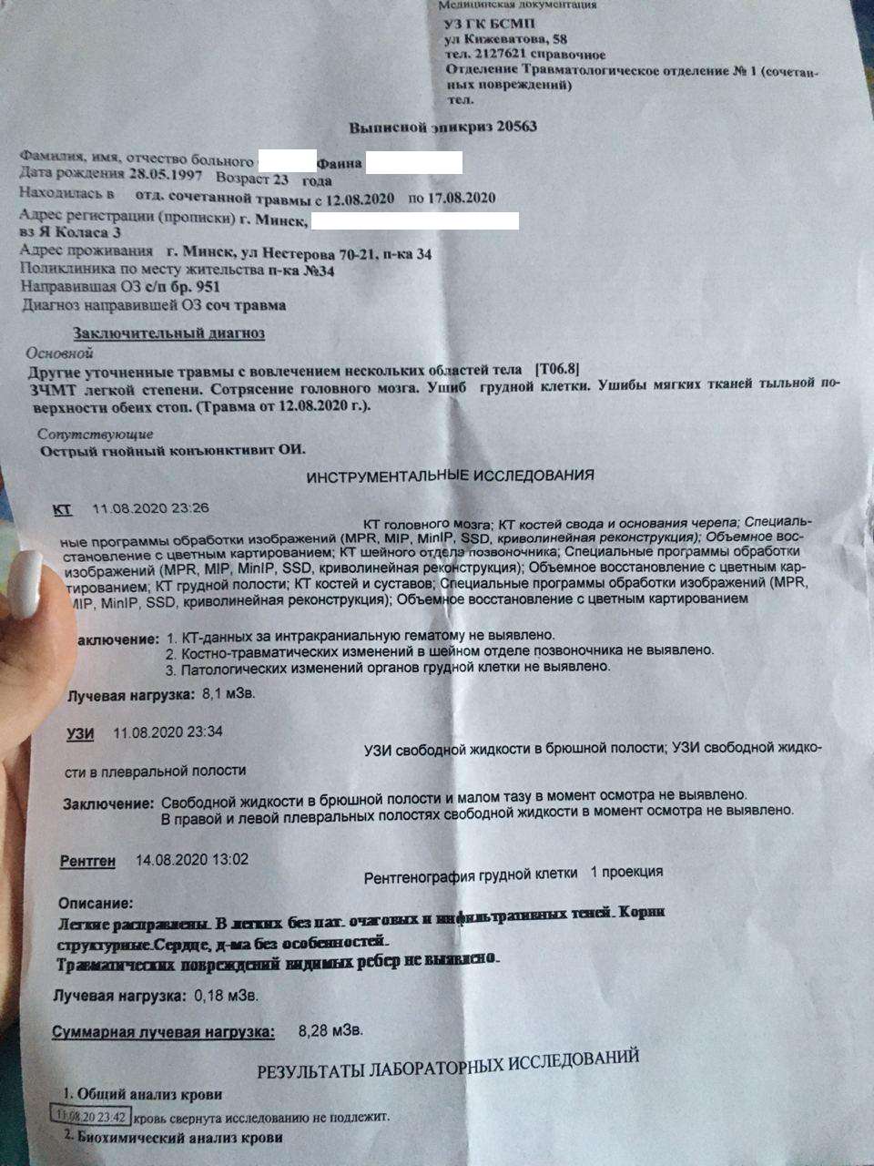 И только с пятой попытки мы вернулись к моим избиениям. Я под запись рассказала, что со мной произошло. Мне выдали постановление на судебно-медицинскую экспертизу, которое я прошла. При этом в постановлении на экспертизу написано, что меня избили невыясненные лица на территории города Минска. Ведь не было зафиксировано, откуда меня забрала скорая.