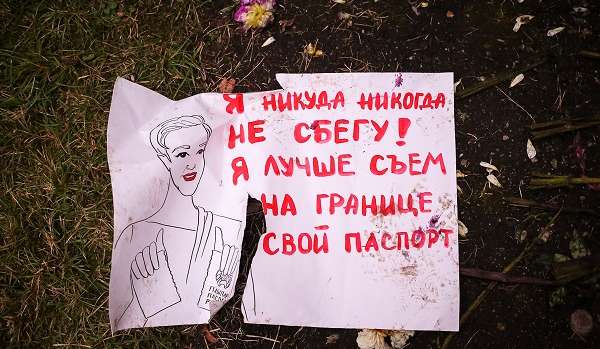 Плакат в поддержку Марии Колесниковой остался на земле после столкновения силовиков с участниками мирной акции солидарности. Фото: Вадим Замировский, TUT.BY