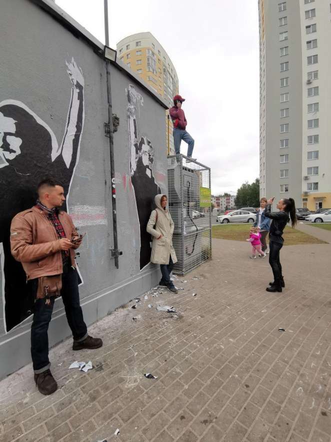 Они собрались закрашивать мурал, но некоторые местные жители встали на его защиту — закрывали работу спинами.