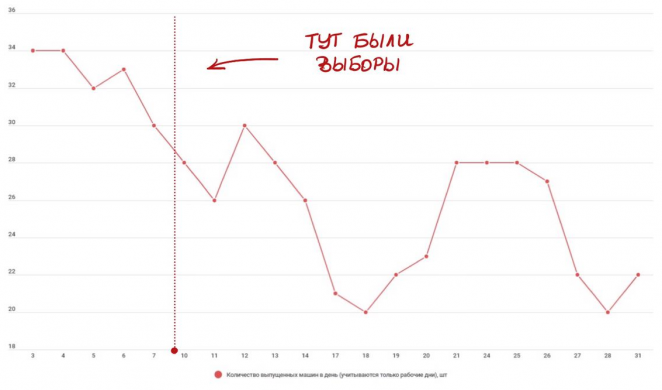 Максимальное отставание от плана каждый месяц этого года до выборов было не более 10%. За август фактически сделали 562 машины при запланированных 732. План почти в полтора раза больше, чем было выпущено. Если проследить интенсивность работы по готовым машинам, то после 9 августа видно, как на треть спало производство. Работники завода считают, что продержаться МАЗу за счет прибыли не удастся, еще больше сокращать зарплаты уже некуда: