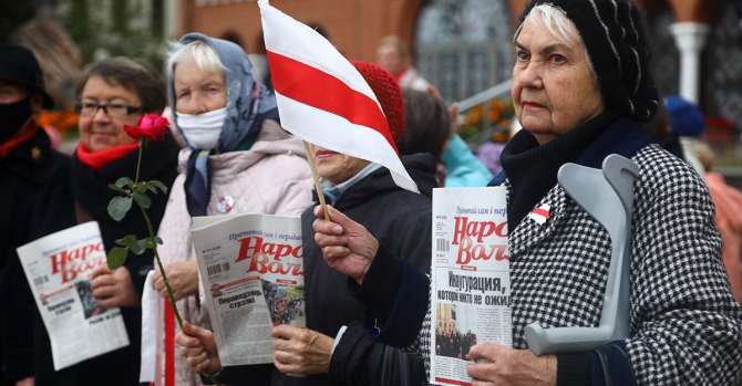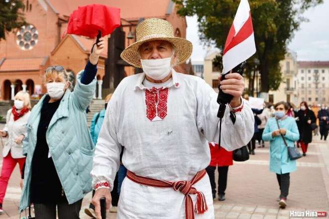 Около сотни человек шествуют по проспекту Победителей. «Бабушки против насилия, дедушки против ОМОНа», — с такими лозунгами пожилые люди с бело-красно-белыми флагами вышли на акцию.