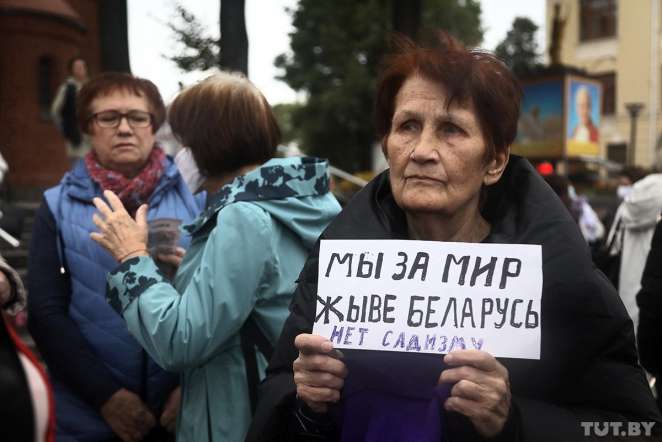 Возле красного костела собрались около 100 пенсионеров, сообщает TUT.BY. Многие из них пришли с цветами и плакатами «Уходи», «Не верю Лукашенко, БТ и RT», «Пенсионеры за перемены».