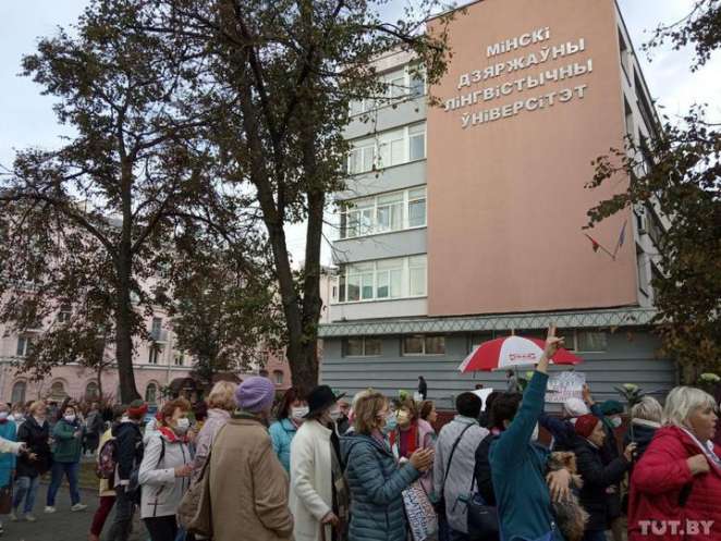 По дороге к площади Якуба Коласа бабушки и дедушки прошли у МГЛУ — чтобы поддержать студентов. Они встретили пенсионеров криками благодарности и бело-красно-белыми флагами из окон: