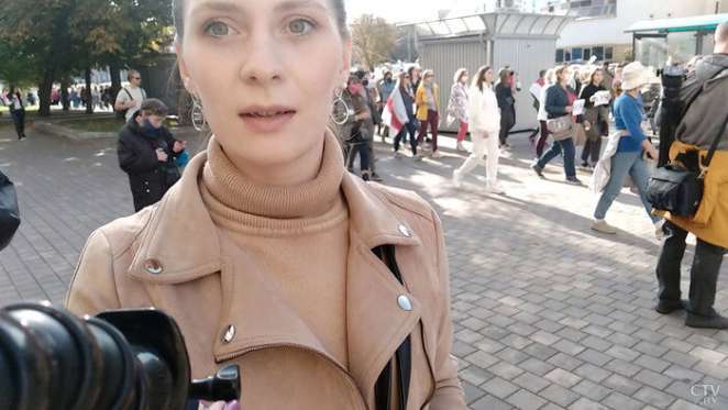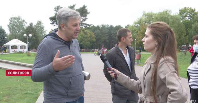 Заметили корреспондентку и в Солигорске в эту субботу. Беря комментарий у мужчины, она убеждала его, что в Беларуси протестующие переворачивают машины во время акций.