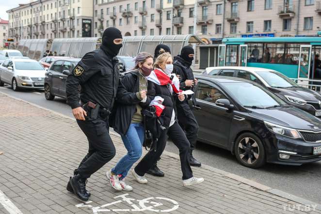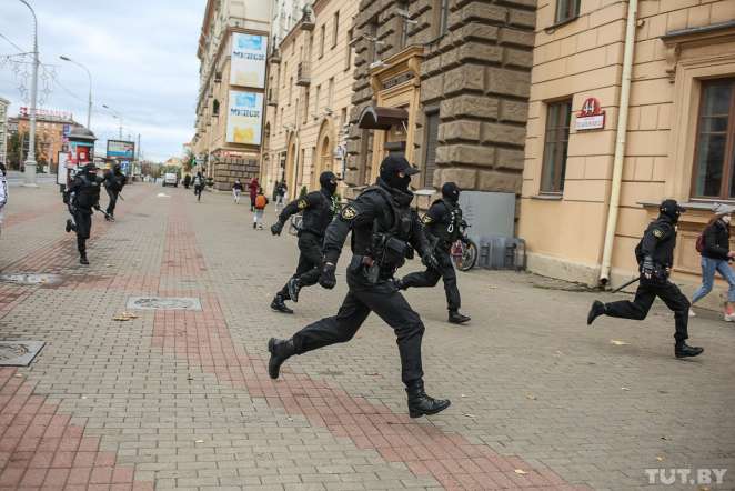 — Марш еще не успевает стартовать, как к МГЛУ подъезжают микроавтобусы — три черных и один желтый — в таких обычно ездят милицейские. Студенты тут же срываются с места и разбегаются от университета двумя группами. Из микроавтобусов никто не выходит. Постояв полминуты, они проезжают дальше по улице, — пишет спецкор Новой газеты. — Ребята формируют колонну. Развернув бело-красно-белые флаги, выдвигаются в сторону проспекта Независимости.
