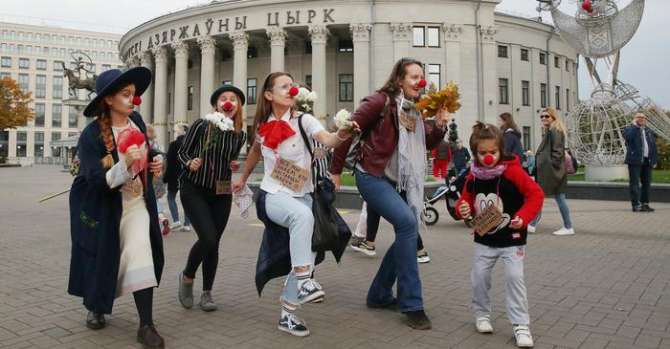 Участники протестов против Лукашенко у здания цирка в Минске