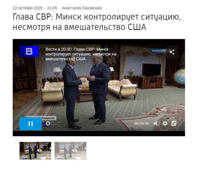 В эту же канву кладется и один из поводов визита главы СВР Сергея Нарышкина в Минск 22 октября. Открытая часть его встречи с Лукашенко — это две с половиной минуты и очень знаковое заявление. По словам Нарышкина, «отдельной ареной борьбы, становится история. Не допустить ее искажения и спекуляции на теме великой Победы – общая задача наших стран…, кто уже только ни оттоптался на теме Второй мировой и Великой Отечественной, а для Белоруссии и России эта война священная». Зритель узнает, что «сегодня в Минске открыли мемориальную доску советским разведчикам Алексею Ботяну и Юрию Дроздову – их называли гениями невозможных операций, а их профессиональные судьбы – золотыми страницами истории отечественной разведки», а на мемориальной доске написано «Славным сынам белорусского народа». Снова общее прошлое и совместные планы на будущее.