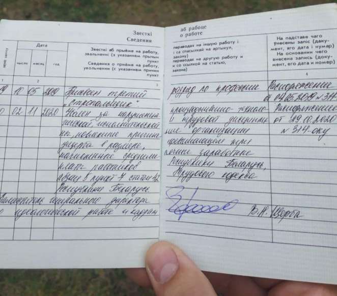 Трудовая книжка одного из уволенных рабочих: "Уволен за нарушение производственно-технологической, исполнительной и трудовой дисциплины, повлекшее причинение организации ущерба, превышающего три начисленные среднемесячные заработные платы работников Республики Беларусь"