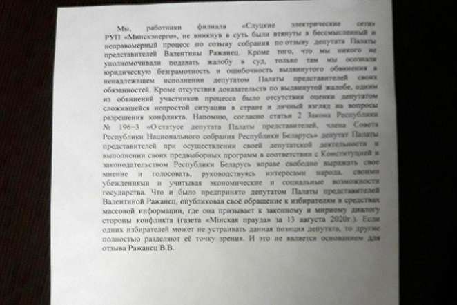 Мы не знаем, достоверное ли это письмо и действительно ли давали его на подпись работникам Слуцких электросетей. Возможно, это просто фейк, призванный дискредитировать предприятие или депутата Ражанец. Фото взято в одном из Telegram-каналов