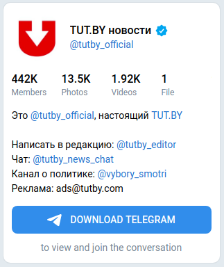 Галочка верификации. У некоторых крупных СМИ стоит синяя галочка рядом с названием канала. Она означает подтверждение от Telegram, что аккаунт настоящий. Например, такие галочки есть у TUT.BY и «Радыё Свабода».