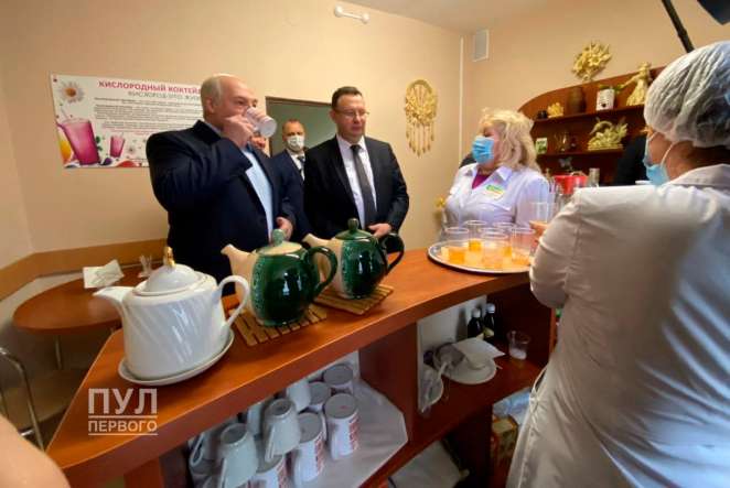 Лукашенко в больнице встречали шторы в БЧБ-гамме. А потом еще и чаем напоили из БЧБ-кружки