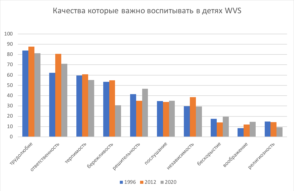 Динамика, фиксируемая WVS в отношении важности воспитания у детей качеств, начиная с волны 1996 года – по свежую волну 2020 года – отчасти отражает наблюдаемые изменения: