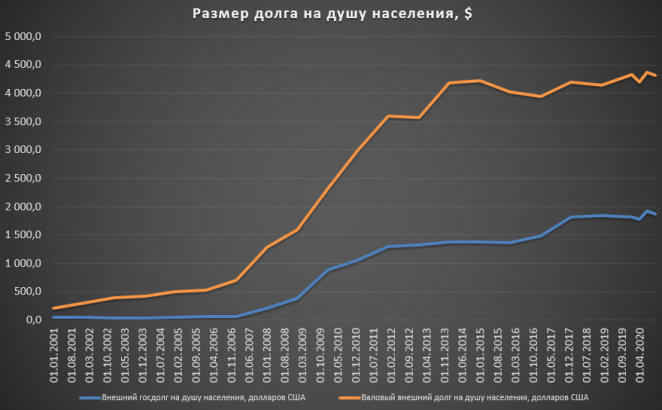 Менее чем за 20 лет размер госдолга на душу населения вырос более чем в 40 раз: