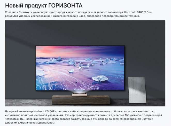 Что такое «лазерный телевизор»? Это проектор, который выводит картинку на стену. Еще в прошлом году «Горизонт» представил свой продукт — Horizont LT400F. «Качество формата 4К с физическим размером 2*3,5 метра доступно при минимальном расположении проектора от стены», - говорилось в описании. Вот как выглядит этот инновационный продукт: