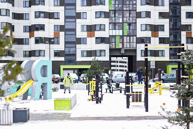 У одного из входов развевается бело-красно-белый флаг. Рядом украшенная елочка и детская площадка, целевая аудитория которой сосредоточена на своих делах. Рядом их родители обсуждают вчерашние события.