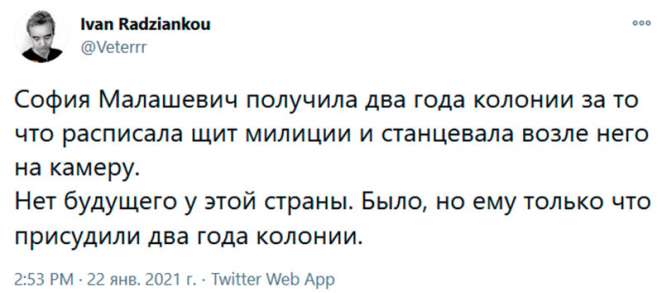«Политические процессы стали будничным явлением, а человек легко огрубляется и привыкает ко всему... Однако, даже с учетом этого приговор два года лишения свободы для 18-летней Софии Малашевич за «роспись» ОМОНовских щитов, это жесть.