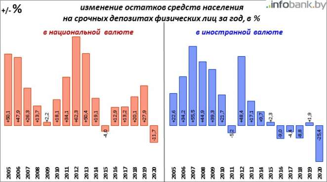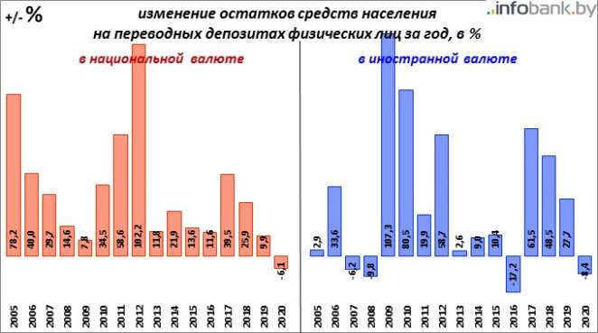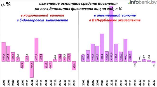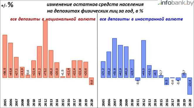 Относительные, в процентах, изменения объема депозитов населения в банковской системе Беларуси за 2020 год таковы: