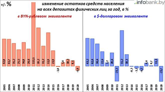 До 2020-го даже в самые «худшие» времена сумма остатков на BYN-депозитах, хоть и не намного, но прирастала по итогам года, а на валютных снижалась намного меньше.