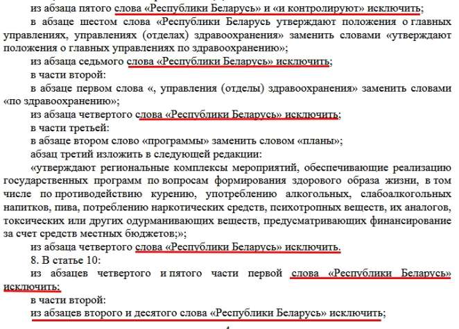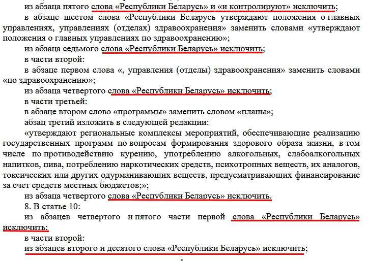 «…Из абзаца шестого статьи 3, абзаца третьего статьи 4, статей 6 и 7, абзацев второго и третьего части первой, частей второй–шестой статьи 11, статьи 12, части первой и абзаца четвертого части третьей статьи 13, части второй статьи 182, статей 19, 21 и 23, части третьей статьи 26, статьи 30, части третьей статьи 36, абзаца восьмого статьи 42, части первой статьи 43, части третьей статьи 47, части второй статьи 48, части первой статьи 49, статьи 52, части второй статьи 53, части третьей статьи 58, статьи 60 и названия главы 12 слова «Республики Беларусь» исключить..»