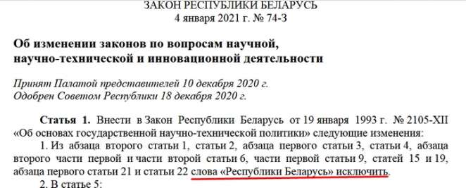 Закон Республики Беларусь от 4 января 2021 г. № 74-З «Об изменении законов по вопросам научной, научно-технической и инновационной деятельности». Принят Палатой представителей 10 декабря 2020 г. Одобрен Советом Республики 18 декабря 2020 г.