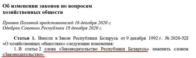 Один из последних опубликованных: Закон Республики Беларусь от 5 января 2021 г. № 95-З Об изменении законов по вопросам хозяйственных обществ продолжает убирать словосочетание «Республика Беларусь»: