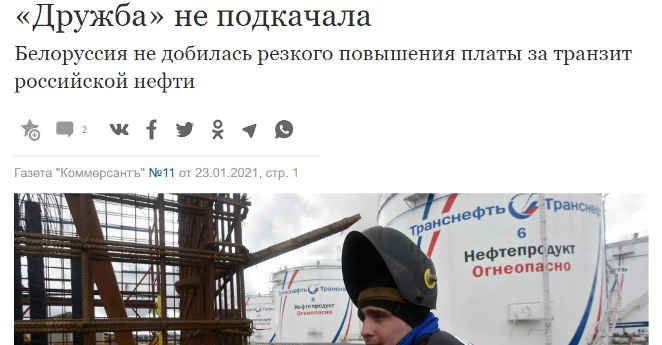 • «Коммерсантъ» подчёркивает «антироссийскую» направленность беларусских программ по развитию собственной нефтетранспортной системы, предлагая такой тезис в качестве фонового объяснения неудачи беларусской делегации по переговорам о цене транзита и компенсации за грязную нефть;