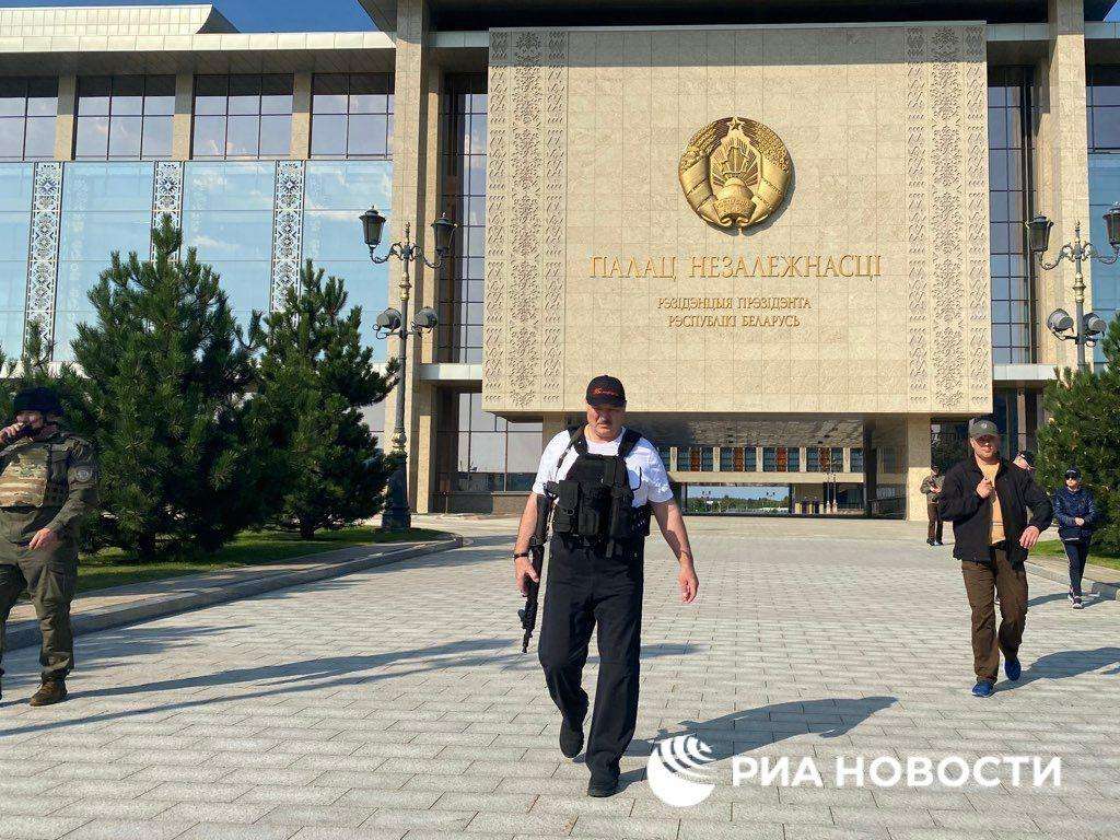 Всем показали, как Лукашенко с автоматом и в бронежилете прилетел на вертолете в резиденцию. Рядом с ним шел 15-летний сын Николай – также в бронежилете и с оружием.