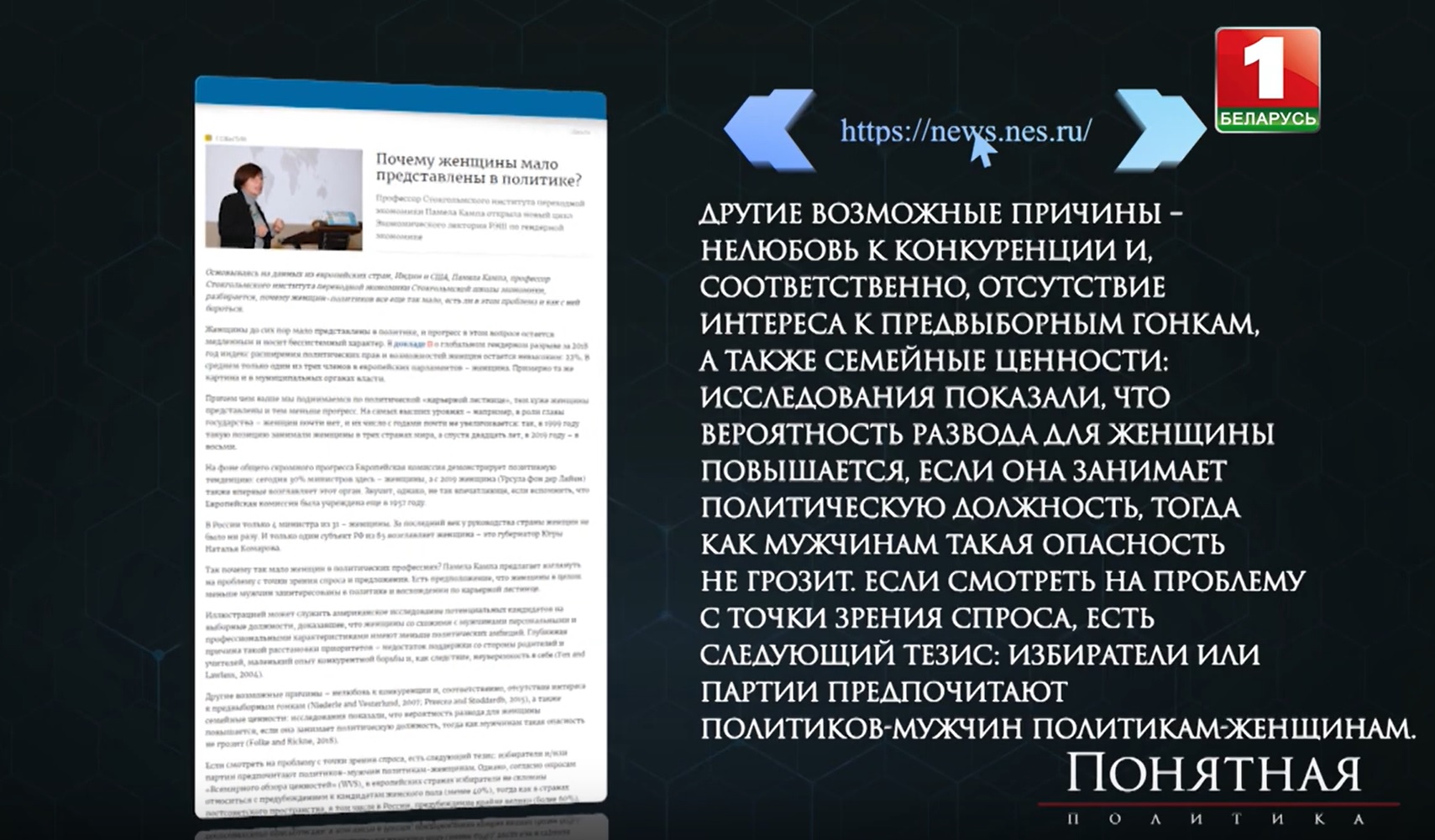 Дальше Гусаченко заявил, что «женщины в мировой политике по-прежнему представлены слабо», и привёл данные профессора Стокгольмского института переходной экономики Памелы Кампа. «Беларусь 1» процитировал тезисы из её лекции, которые в ноябре 2019 года опубликовал сайт Российской экономической школы: