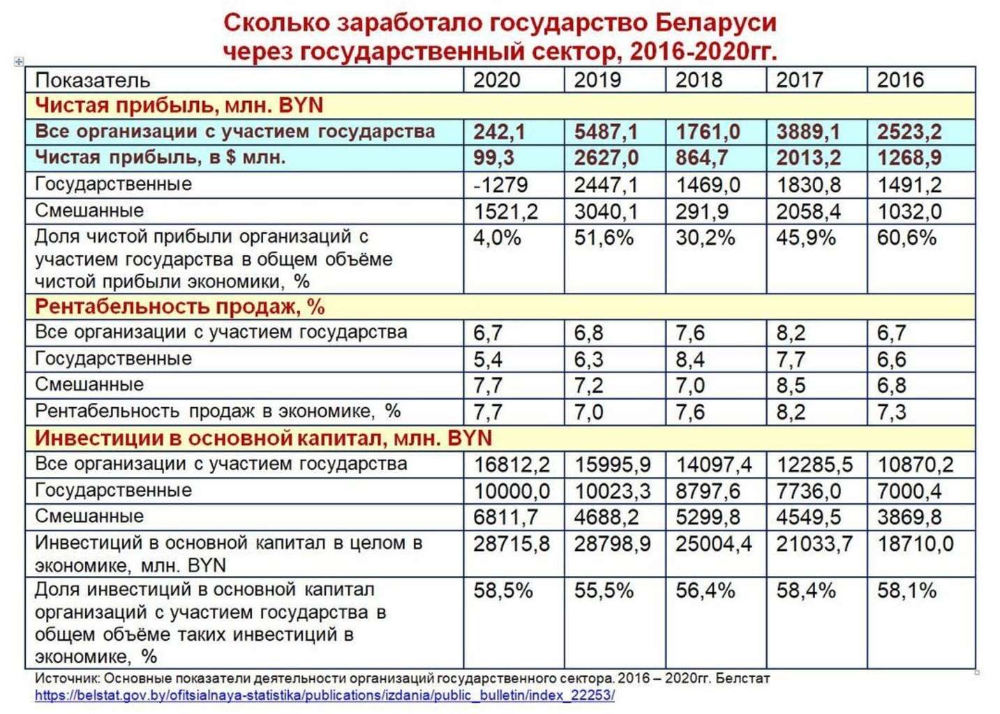 2020-й год стал временем оглушительного провала. Чистая прибыль государственного коммерческого сектора (3169 больших и средних предприятий) составила мизерные $99,3 млн. Это всего 4% от общего объёма чистой прибыли в экономики страны. По сравнению с 2019г. объём чистой прибыли обвалилась в 22,7 (!) раза. Причём в 2019г. каждый второй рубль чистой прибыли был заработан коммерческими организациями с участием государства. В 2020г. из каждых BYN100 чистой прибыли с участием государства было заработано только BYN4. Причём чисто государственные организации (без участия частного капитала) вообще закончили 2020-ый год с чистыми убытками в BYN1,3 млрд.
