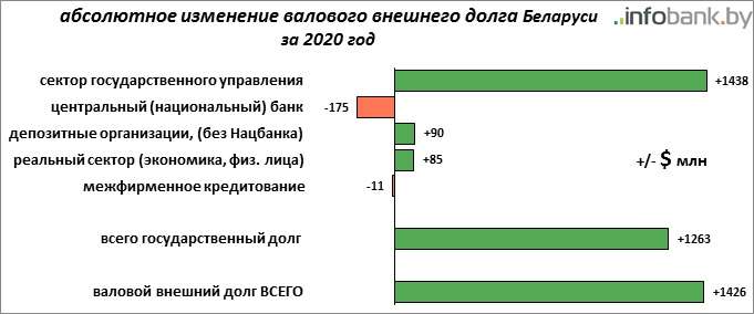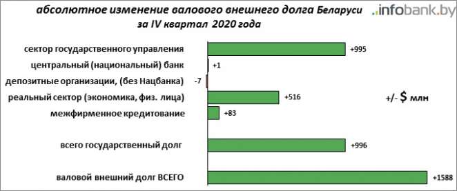 И прирост всего – валового – внешнего долга Беларуси в IV квартале 2020-го, приведший к рекордному объему ВВД, создан, главным образом, в секторе государственного управления: из всего прироста ВВД в $1,588 млрд за квартал, .прирост в этом секторе – почти $1 млрд.