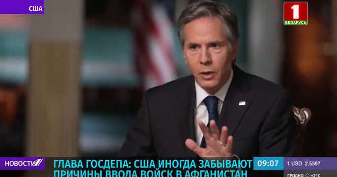 В интервью речь шла и про вывод американских войск из Афганистана. По выражению «Беларусь 1», «госсекретарь правдиво отметил, что США уже и забыли, зачем вводили в страну войска 20 лет назад». Но в оригинале фраза Блинкена звучала не так: