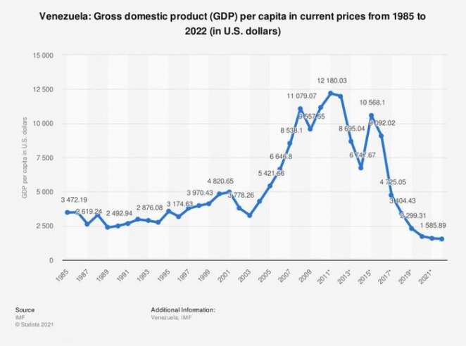 Вот посмотрите на Венесуэлу — с 2013 года, когда популистская диктатура Чавеса сменилась военной диктатурой Мадуро, ВВП на душу населения упал настолько, что Венесуэла теперь — самая бедная страна в мире. Это уровень производства 1945 года!