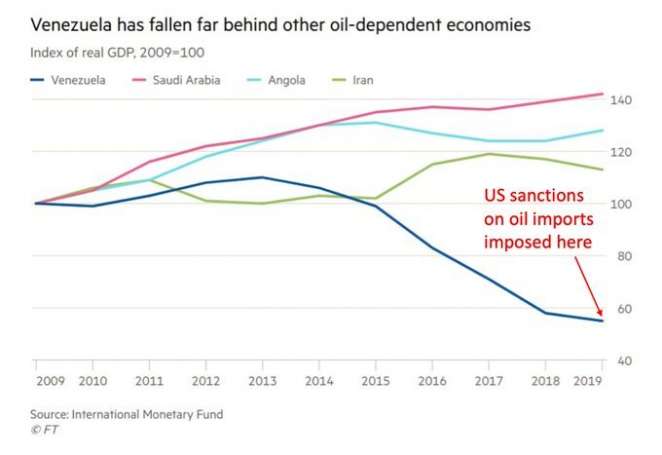 За последние двадцать лет я много писал про Венесуэлу — потому что это важный пример — была колонка «Учитель Чавес» в VTimes в 2007 году, потом «Учитель Мадуро» в 2017-м. Имеется в виду — учиться на чужих ошибках. Не национализировать предприятия, не вводить контроль над розничными ценами, не выдавливать из страны сначала журналистов, потом предпринимателей… (Тем, кто собирается написать идиотский комментарии про «роль санкции США» — посмотрите на график ниже. Сначала катастрофа, потом санкции.)