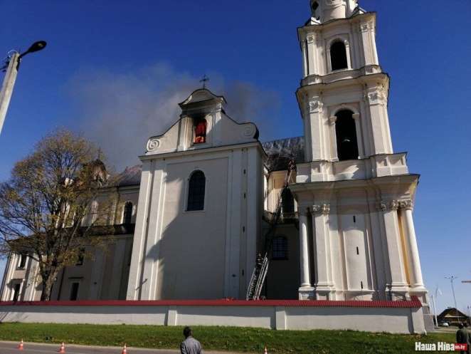 Пожарные по рациям передали, что изнутри костела действовать невозможно. Работают на лестницах. На пожар съехались бригады из всех соседних районов Минской и Витебской областей.
