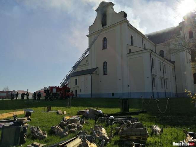 Читатели «Нашай Нівы» прислали фото с пожарными, которые приехали спасать достопримечательность. Верующие тем временем выносили ценные вещи, опасаясь, что крыша обрушится.