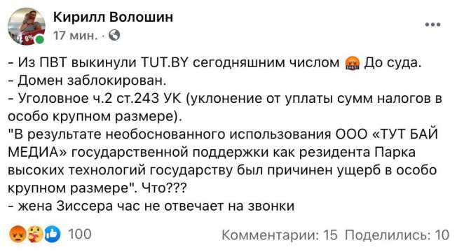 Позже стало известно, что в отношении должностных лиц TUT.BY возбуждено уголовное дело по признакам состава преступления, предусмотренного частью 2 статьи 243 УК Республики Беларусь (уклонение от уплаты сумм налогов, сборов в особо крупном размере).