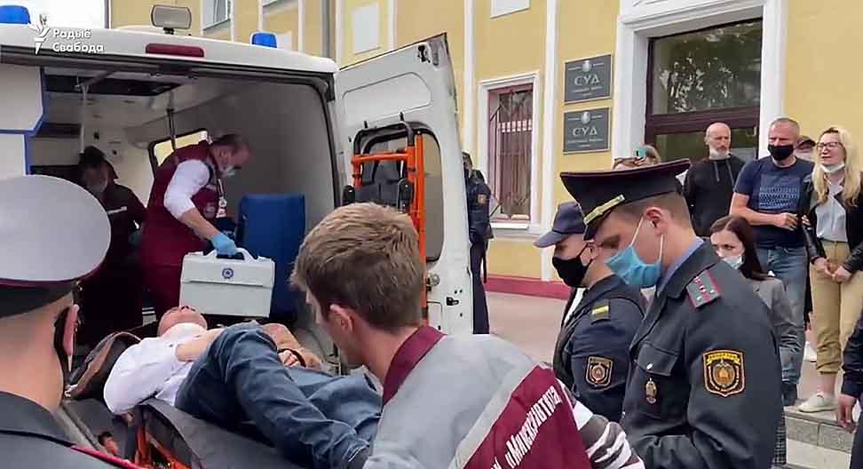Политзаключенного вынесли из зала суда на носилках в сопровождении милиции и увезли.