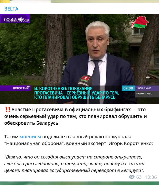 Произошла эволюция отношения к Протасевичу. Когда в самом начале агитпроп пытался одновременно отвергать версию захвата самолета для ареста Протасевича и при этом дискредитировал саму эту фигуру («Протасевич не жертва, а террорист»), говорил о спланированной провокации («Запад (Вячорка) «слил» Протасевича, чтобы устроить провокацию против Беларуси»), то теперь уже Протасевич стал источником «независимых» оценок о штабе экс-кандидата в президенты Светланы Тихановской, Народного антикризисного управления Павла Латушко и поставщиком доказательств раздрая в оппозиционных кругах, и на этом фоне дискредитация самого этого спикера почти прекратилась.