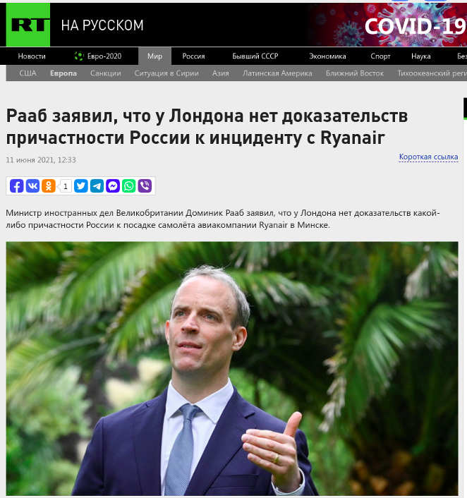 Телеканал «Россия 1» цитирует заявление министра иностранных дел Беларуси Владимира Макея, что «Запад не заинтересован в расследовании инцидента с экстренно приземлившимся в Минске самолетом авиакомпании Ryanair». Подчеркивается, что Беларусь всячески способствует проведению расследования «причем, исходя из требований ИКАО, продемонстрировала все относящиеся к нему материалы». И на фоне такой позиции Беларуси, как отмечает Макей, «западные страны уже не желают этого расследования». (В беларусских СМИ эту мысль «Результаты расследования по инциденту с рейсом Ryanair не нужны никому, кроме Беларуси» проводит в первую очередь директор Департамента по авиации Министерства транспорта и коммуникаций Артем Сикорский).