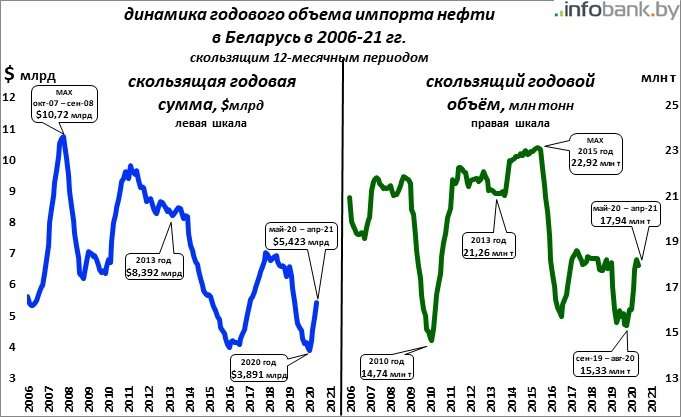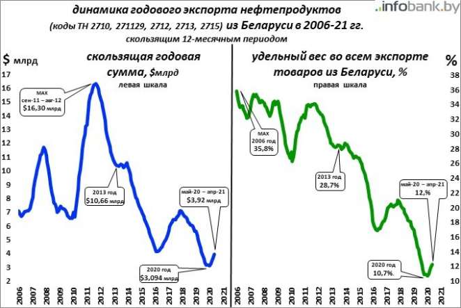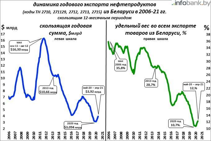 За последние 12 месяцев (с мая 2020 года по апрель 2021-го) этих нефтяных товаров было экспортировано 12,5 млн тонн на сумму $3,92 млрд. Что есть 12,3% о всего товарного экспорта Беларуси ($32,015 млрд за этот 12-месячный период).