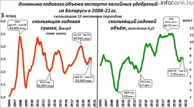 за последние 12 месяцев (с мая 2020 года по апрель 2021-го) – $2,542 млрд: 7,751 млн тонн К2О по $328/т.