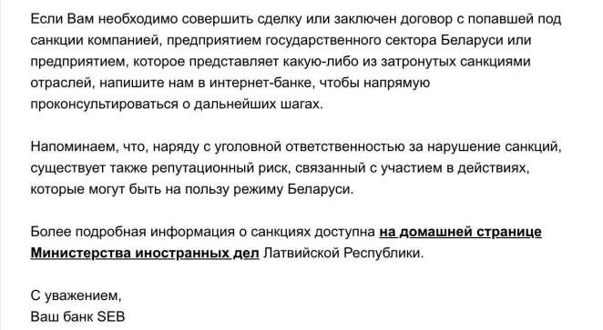 Скриншот из письма банка SEB, который недавно получили многие его клиенты