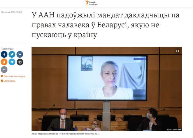 Так, беларусские негосударственные СМИ сделали акцент на том, что мандат спецдокладчика ООН по Беларуси Анаис Марин продлили ещё на год. Об этом в частности написали «Радыё Свабода», «Белорусский партизан», Reform.by. При этом «Радыё Свабода» и Reform.by уточнили, что официальный Минск не признаёт мандат спецдокладчика.