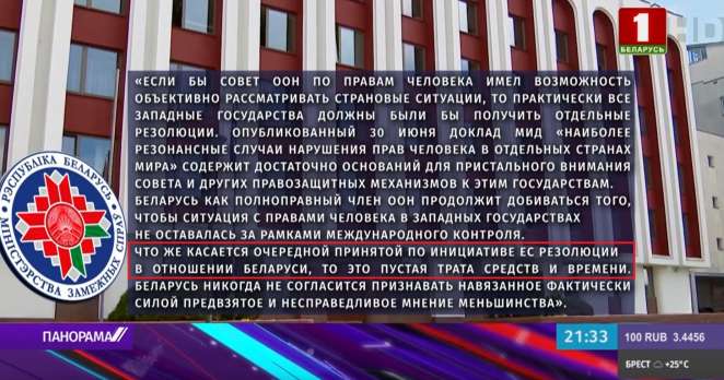 «Беларусь 1» в одном сюжете сказал о провале резолюции СПЧ ООН и процитировал МИД Беларуси, который назвал «принятую по инициативе ЕС резолюцию в отношении Беларуси» «пустой тратой средств и времени». То есть зрителей сначала заверили, что резолюция не нашла поддержки, а через минуту из официального комментария они узнали, что её всё-таки приняли.