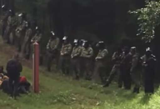 В Сети опубликовало видео, на котором белорусские силовики с автоматами и со щитами выдавливают мигрантов на территорию Латвии