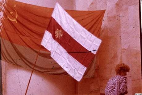 Начало внеочередной сессии Верховного Совета 12 созыва, на которой была объявлена независимость Беларуси, 24 августа 1991 года (с флагом –Валентин Голубев, Зенон Позняк, Ольга Голубович)