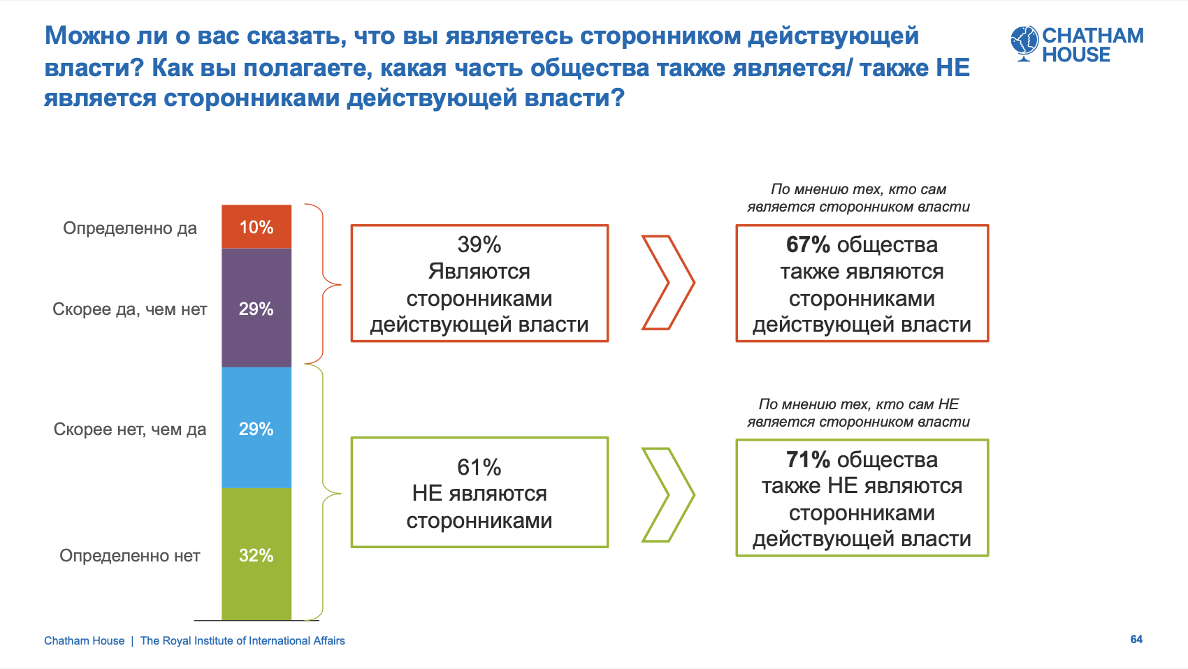 И оказалось, что сторонники власти из этого вопроса считают в среднем, что их в стране 67%, а противники – что их 71%. Это значит, что ошибаются и те, и те. Но провластные ошибаются больше чем в полтора раза, а их оппоненты – всего лишь на 10 процентных пунктов. Информационные пузыри делают свое дело, но тот, что надулся вокруг провластного лагеря, значительно плотнее.