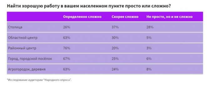 Второй блок проблем связан с «экономической депрессией». После кризиса 2016 года усилился разрыв между Минском и регионами. Одинаково и Минск, и регионы беспокоят высокие цены. Отъезд местных жителей беспокоит 20% опрошенных в Минске и 11% - в регионах. А вот сложности с поиском работы беспокоят лишь 4% минчан и аж 20% опрошенных в областях. То, что работу найти сложно, признали 76% опрошенных в маленьких городах, 63% - в области и 26% - в Минске. Причиной этого, по мнению Родненкова, является деградация госпредприятий и бюджетного сектора, где в основном работают жители регионов. По результатам опроса стало ясно, что как из Минска, как и из областных городов люди стали чаще выезжать на заработки.