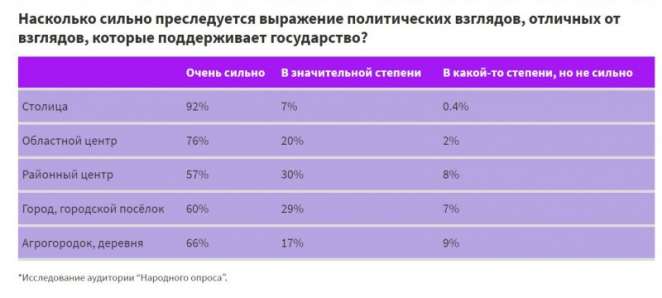 92% опрошенных в столице считает, что власти репрессируют несогласных «очень сильно». При этом чем меньше город, тем меньше людей с таким мнением. Различия же между областями Беларуси несущественны. «Больше корреляции проходит между размерами городов, чем между областями», — рассказал Родненков.